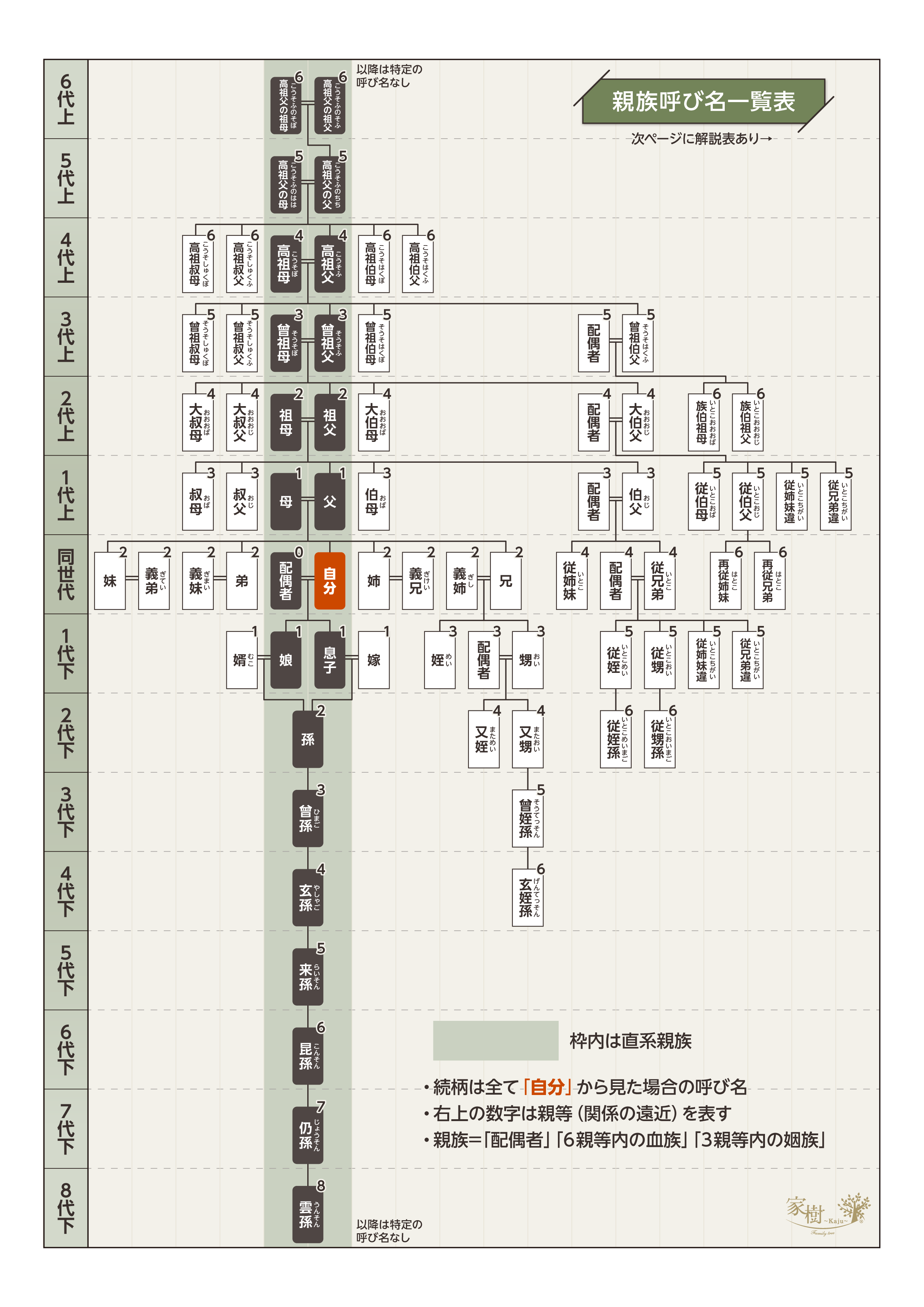 | 世代 | 呼び名・続柄 | 自分から見た関係 | 親等 |