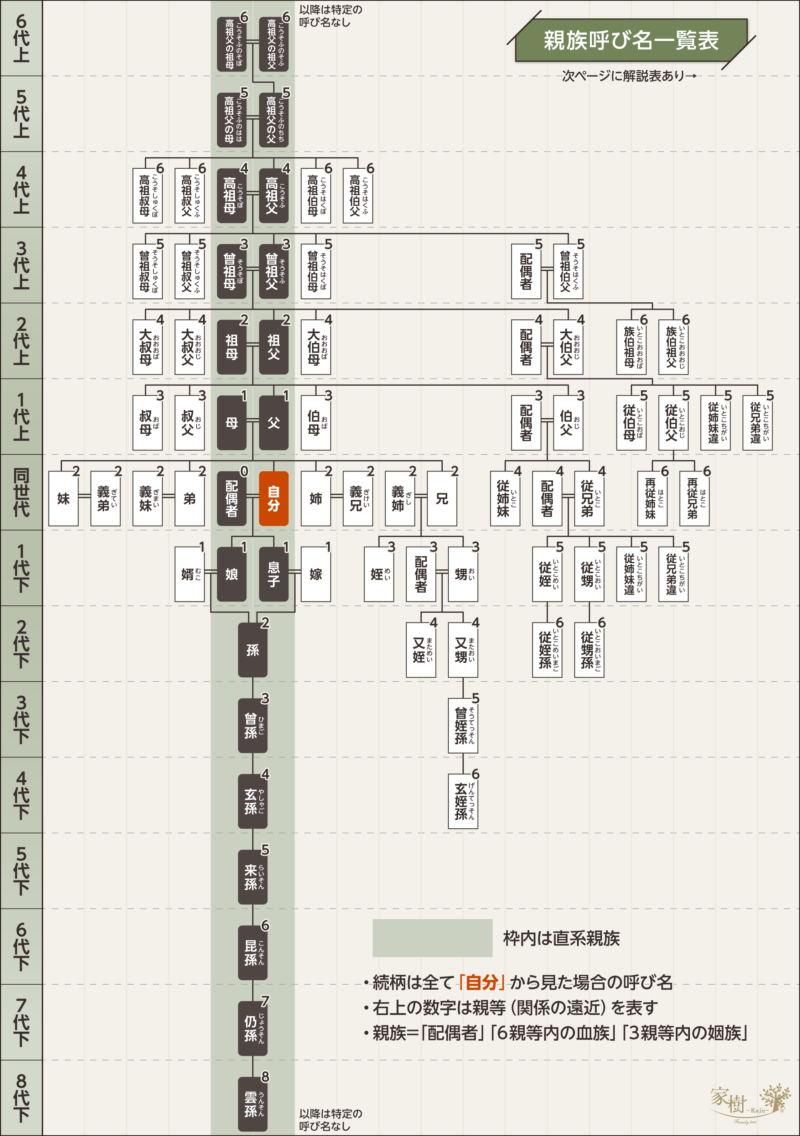 - 親族の呼び名(続柄)の右上に載っている数字が「親等の数」を表している